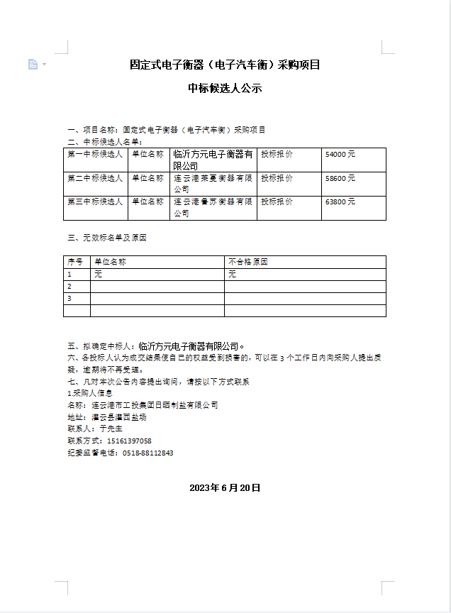 固定式电子衡器(电子汽车衡)采购项目 中标候选人公示