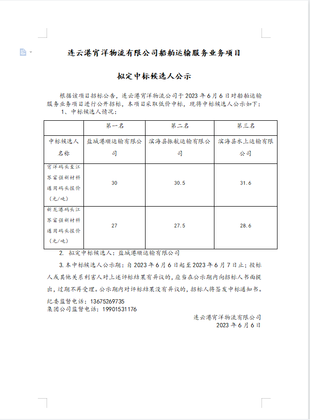 连云港宵洋物流有限公司船舶运输服务业务项目拟定中标候选人公示