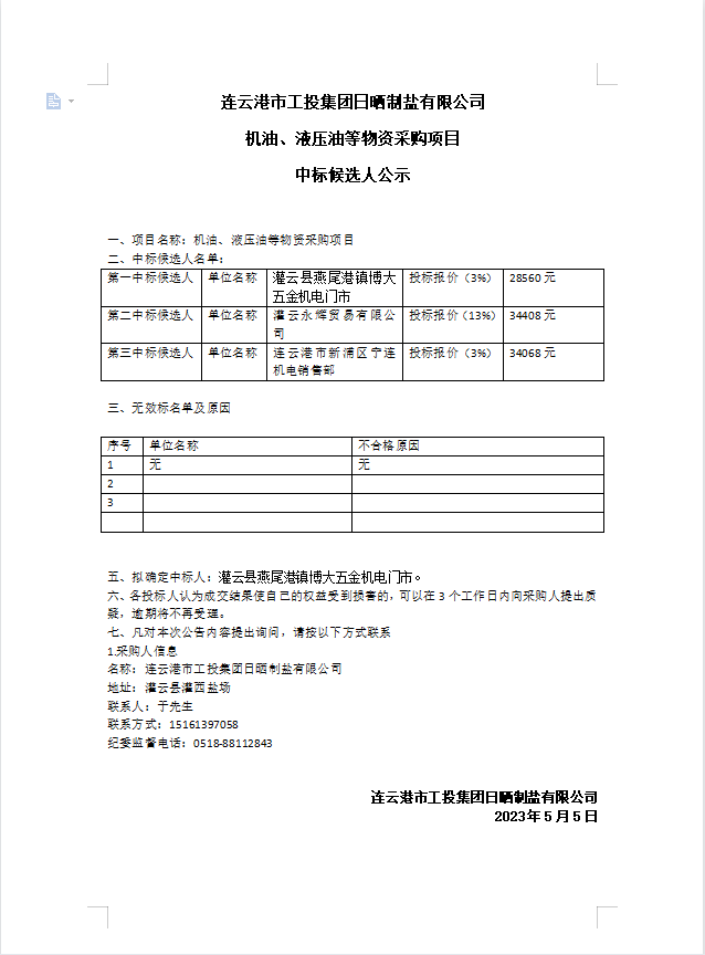 连云港市工投集团日晒制盐有限公司机油、液压油等物资采购项目中标候选人公示