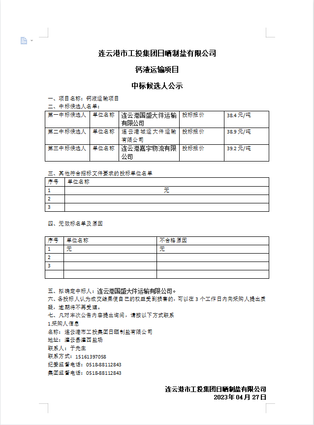 连云港市工投集团日晒制盐有限公司钙液运输项目中标候选人公示