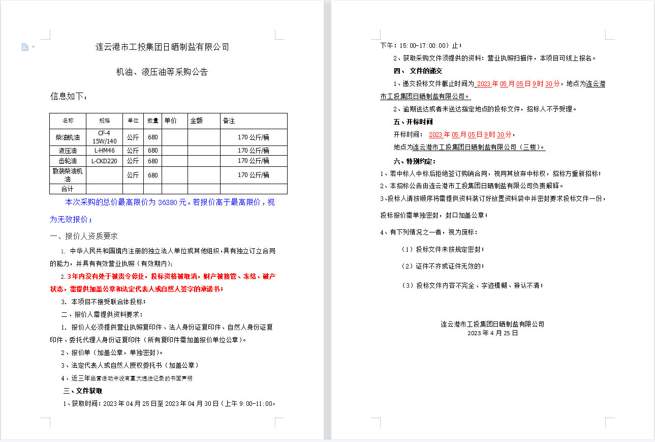 连云港市工投集团日晒制盐有限公司 机油、液压油等采购公告