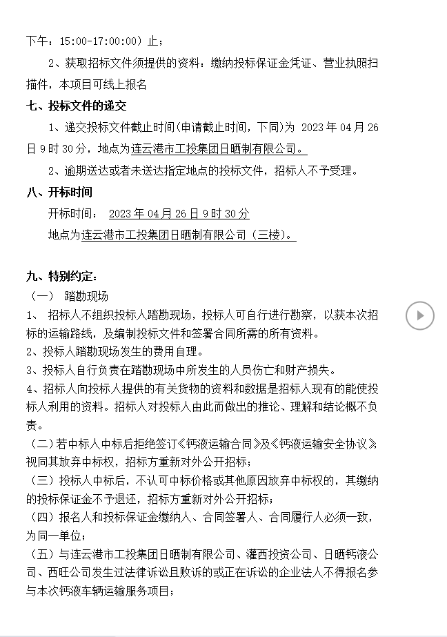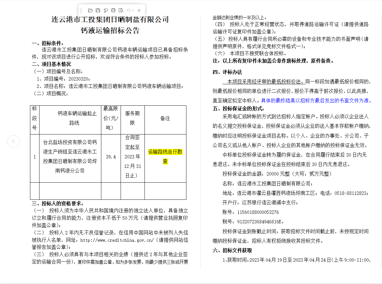 连云港市工投集团日晒制盐有限公司钙液运输招标公告