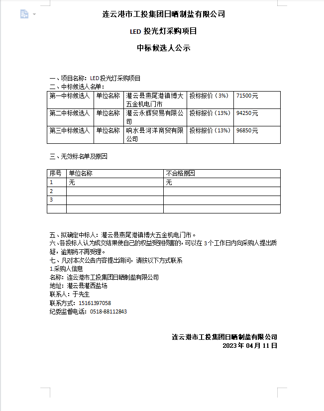 连云港市工投集团日晒制盐有限公司LED投光灯采购项目中标候选人公示
