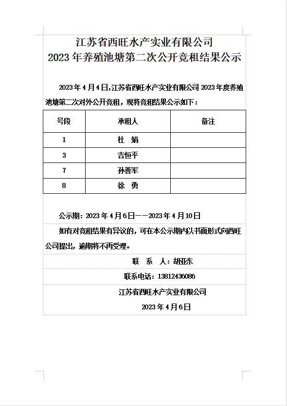 江苏省西旺水产实业有限公司2023年养殖池塘第二次公开竞租结果公示