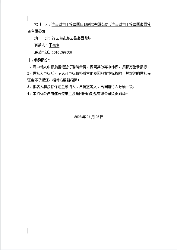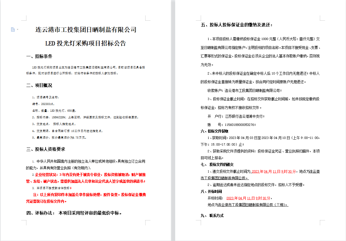 连云港市工投集团日晒制盐有限公司LED投光灯采购项目招标公告