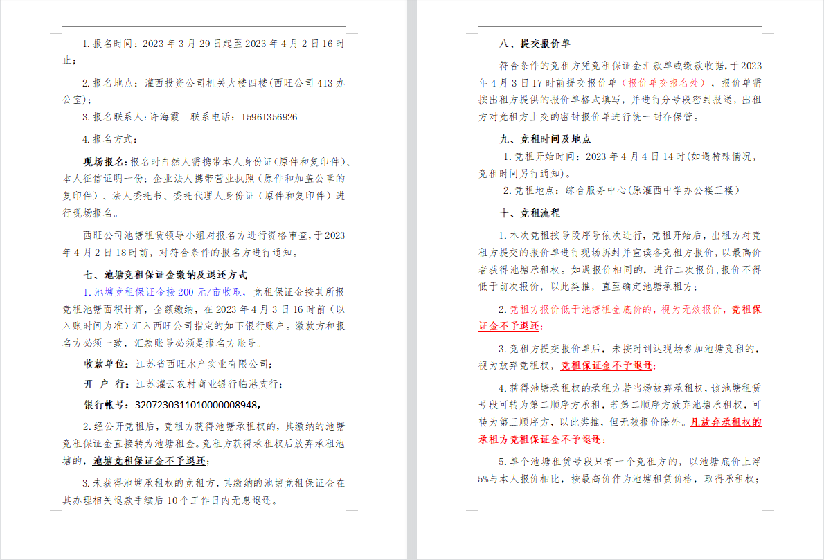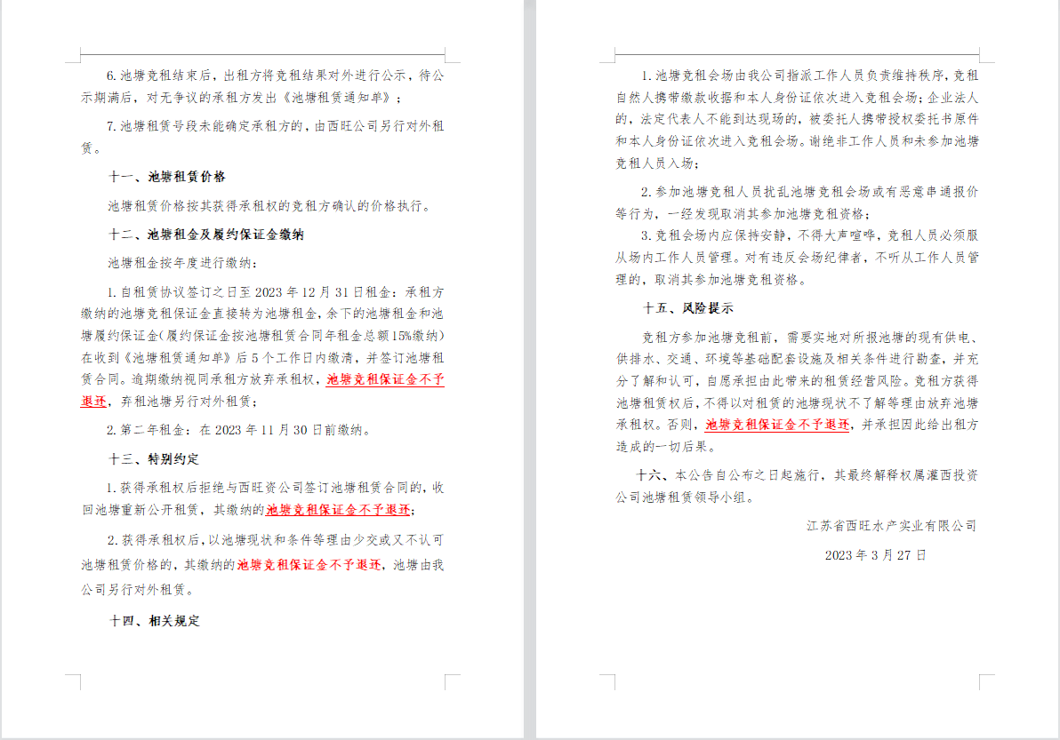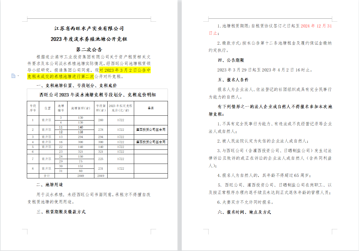 江苏省西旺水产实业有限公司2023年度淡水养殖池塘公开竞租第二次公告