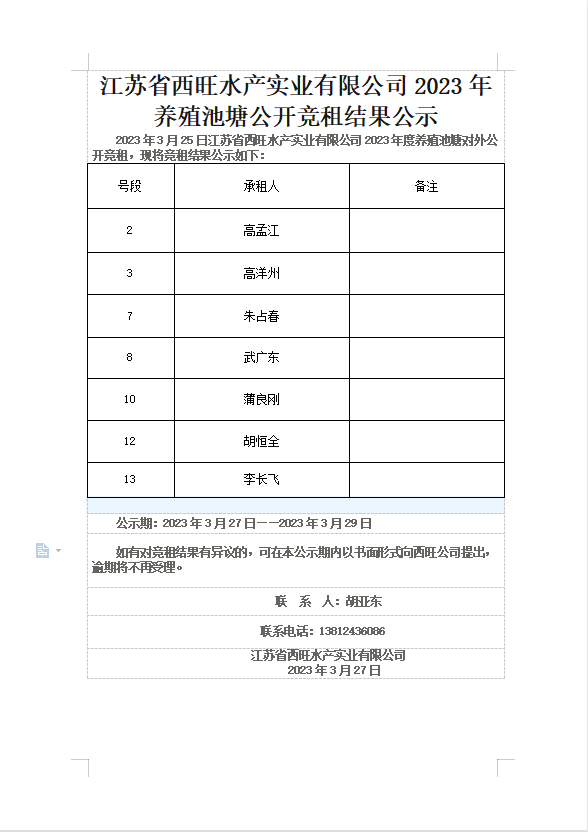 江苏省西旺水产实业有限公司2023年养殖池塘公开竞租结果公示