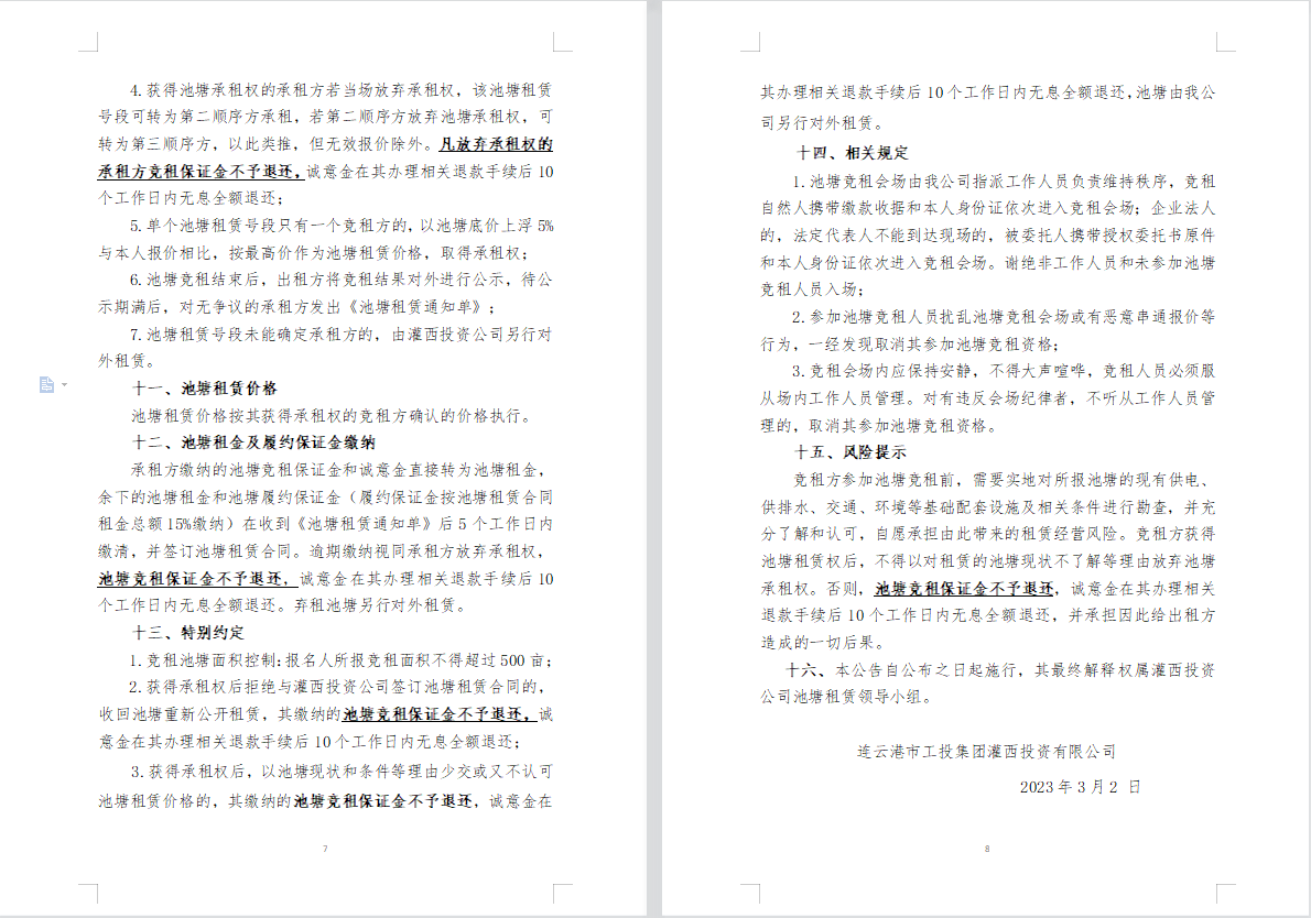 连云港市工投集团灌西投资公司2023年度淡水养殖池塘公开竞租公告
