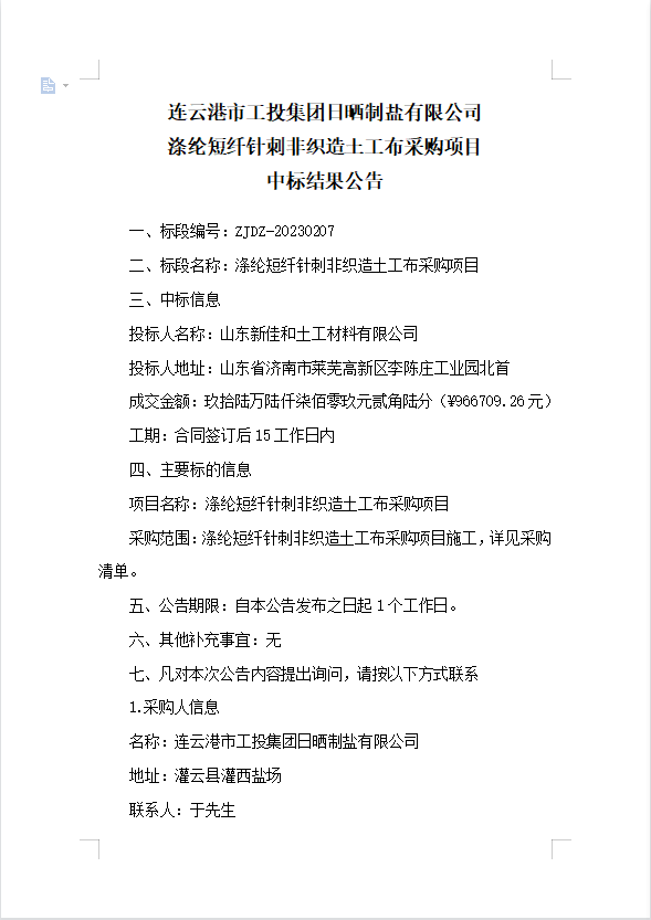 连云港市工投集团日晒制盐有限公司涤纶短纤针刺非织造土工布采购项目中标结果公告