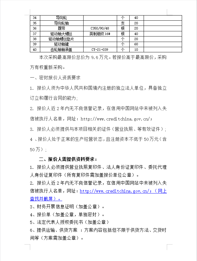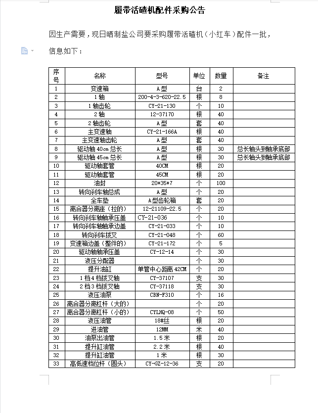 履带活碴机配件采购公告