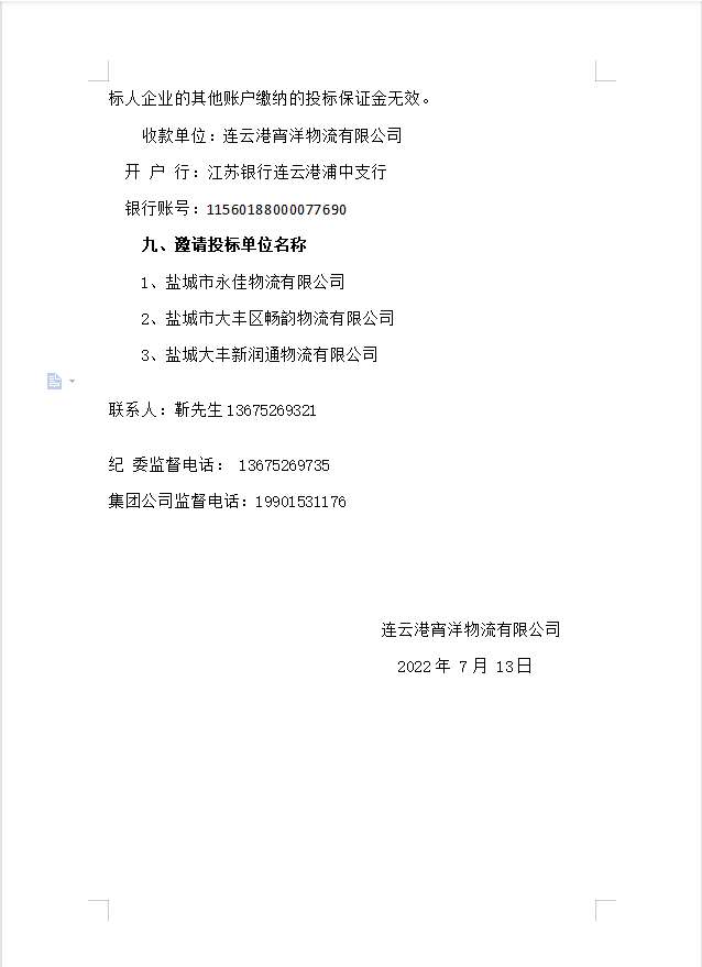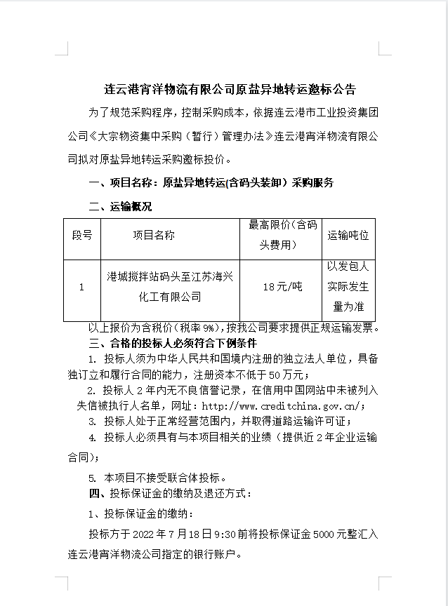 连云港宵洋物流有限公司原盐异地转运邀标公告