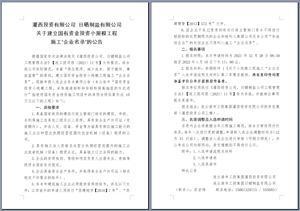 关于建立国有资金投资小规模工程 施工“企业名录”的公告