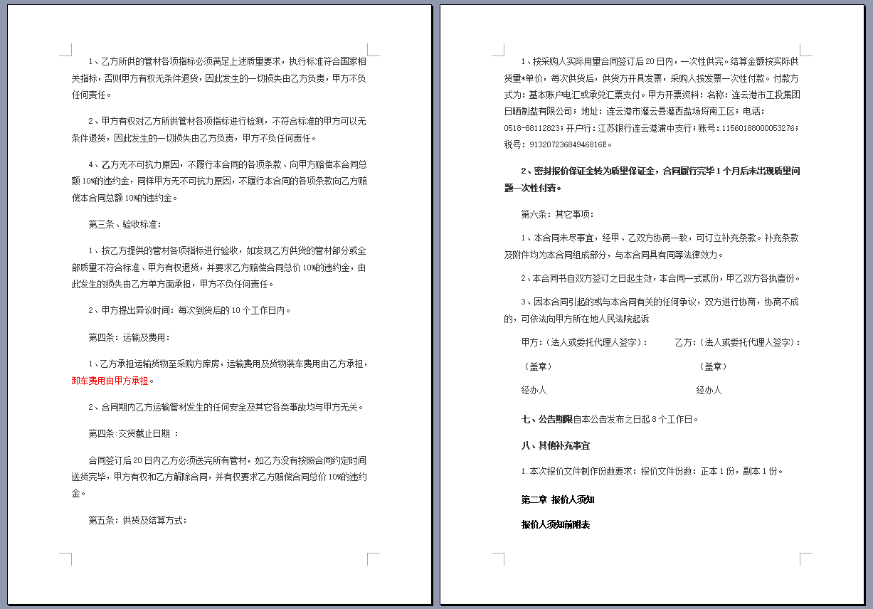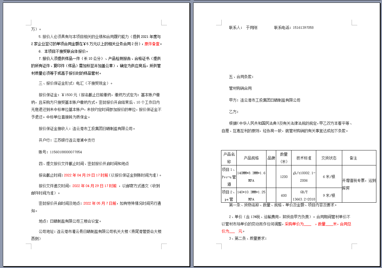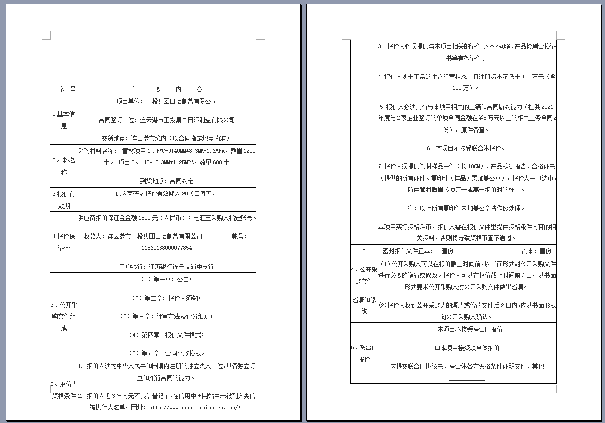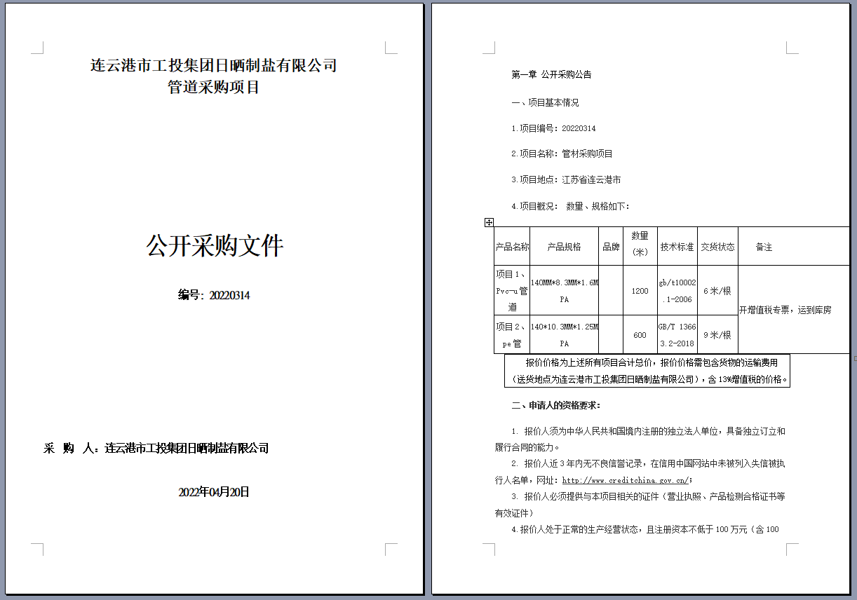 连云港市工投集团日晒制盐有限公司管道采购项目 公开采购文件