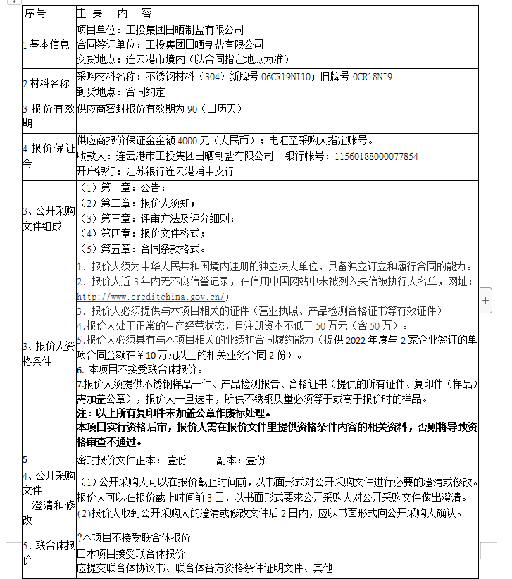 报价保证金接收人:连云港市工投集团日晒制盐有限公司。