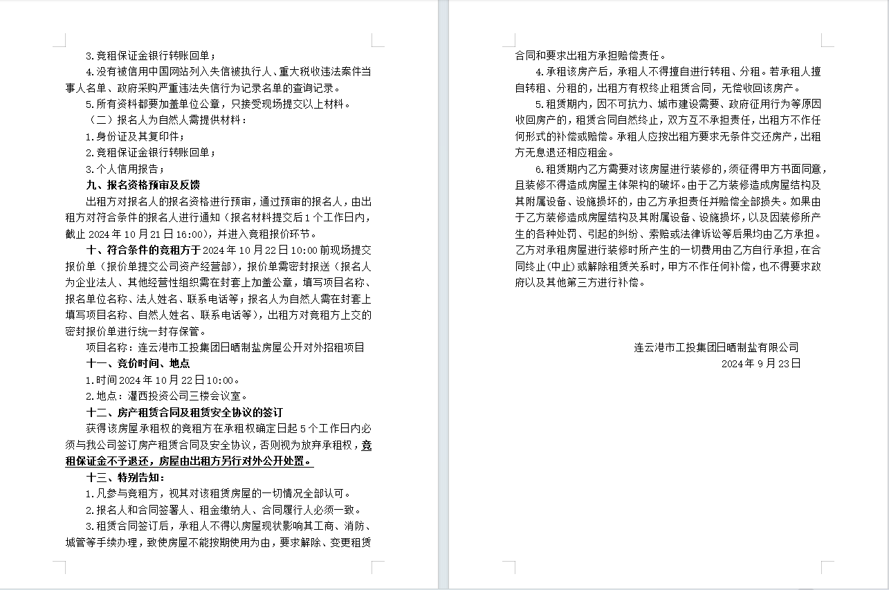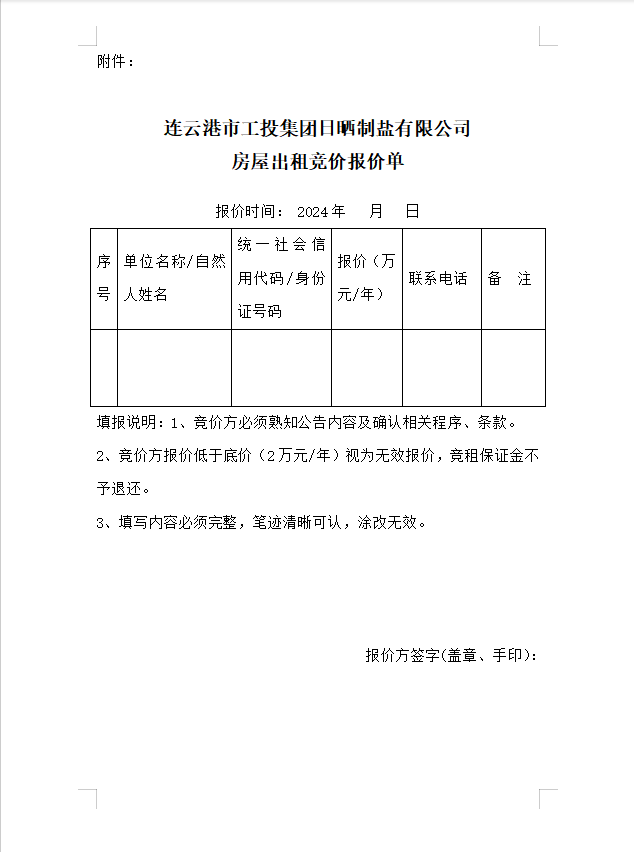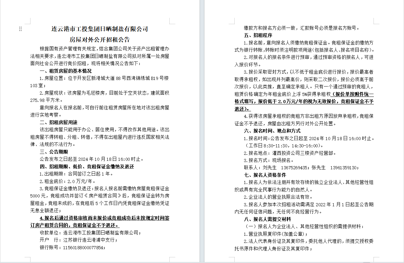 连云港市工投集团日晒制盐有限公司 房屋对外公开招租公告