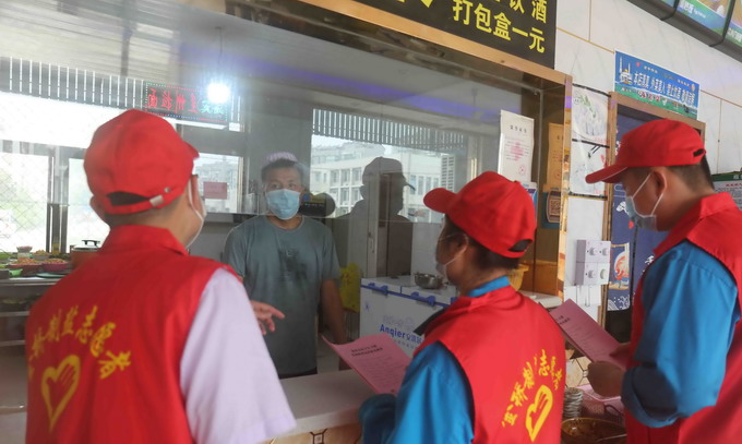 组织志愿者到板桥社区内的饭店、居民区等地分发《疫情防控倡议书》和疫情防控知识手册