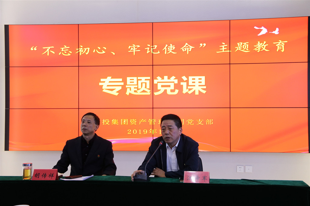 | 为教育引导党员干部不忘初心,牢记使命,担当作为,开拓创新,奋力谱写金融工作新篇章,10月10日下午,资产管理公司党支部举行“不忘初心、牢记使命”主题教育党支部书记讲党课活动,资产管理公司党支部书记、董事长胡传祥同志讲授“初心不改,担当作为,创造无愧于时代的工作业绩”主题党课,集团党委第一指导组同志到会指导。