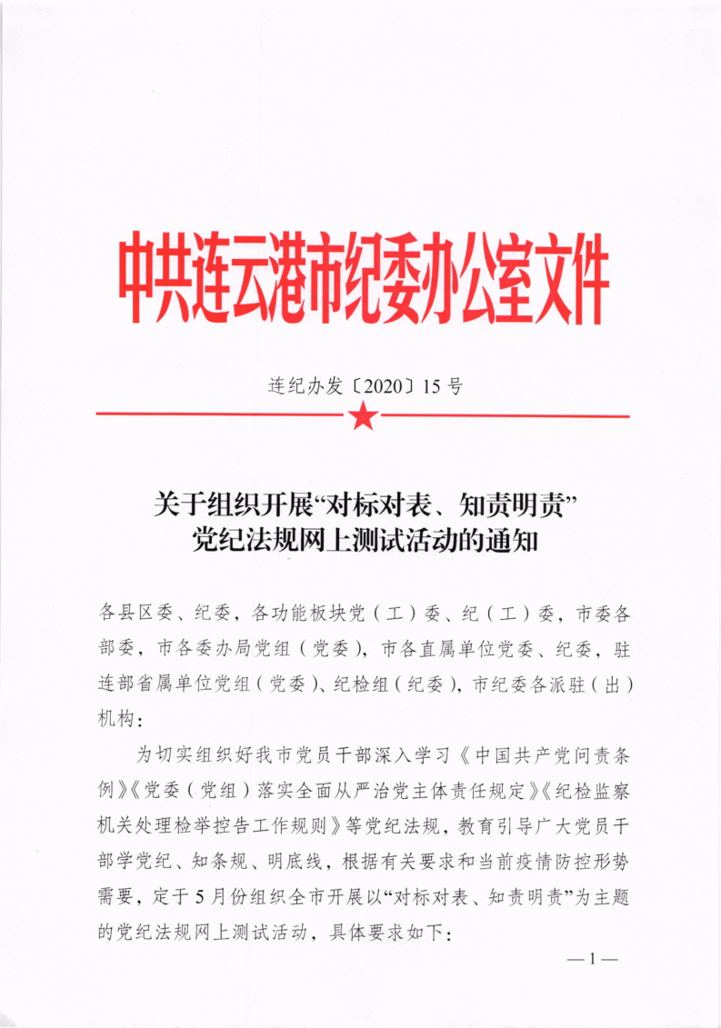 关于组织开展“对标对表、知责明责”党纪法规网上测试活动的通知