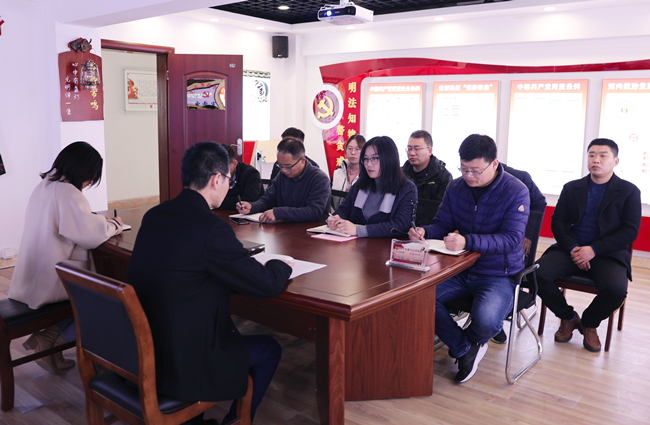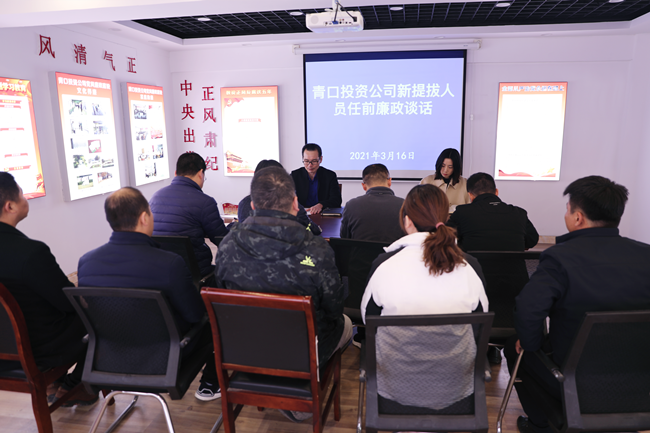 3月16日下午,青口投资公司纪委书记朱文兵对九名新提拔人员进行任前集体谈话,相关人员参加了此次会议。
