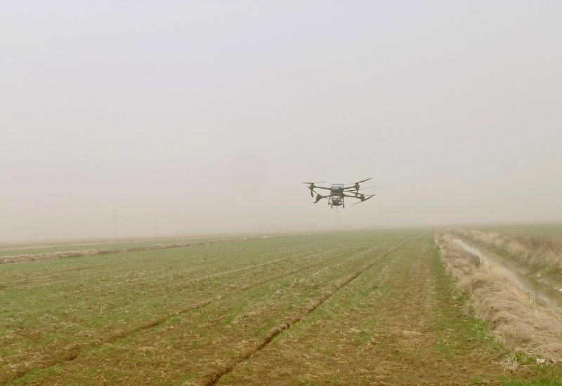 3月23日,大新农场正在使用植保机开展小麦施肥作业。