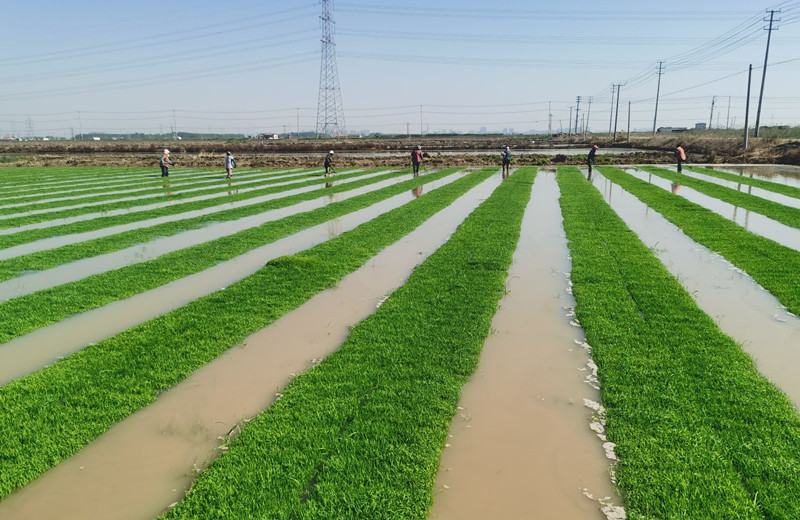 近日,大新农场自营农田机插秧苗已全部揭开无纺布,秧苗整体长势较好,一片绿意盎然。目前播种较早的秧苗苗龄在三叶一心。(刘 杨)