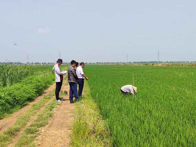 针对近期高温高湿天气,为做好水稻生产管理中期生产工作, 7月25日,农场管理人员和农技师顶着烈日深入田间地头,对水稻基本苗的苗情苗量、病虫害情况、中期水浆管理逐条田组进行水稻中期生产检查,对下一步的水浆管理和综合防治提出指导意见,要求适时搁田,并于7月底至8月上旬进行一次综合防治。 (陈 琛)