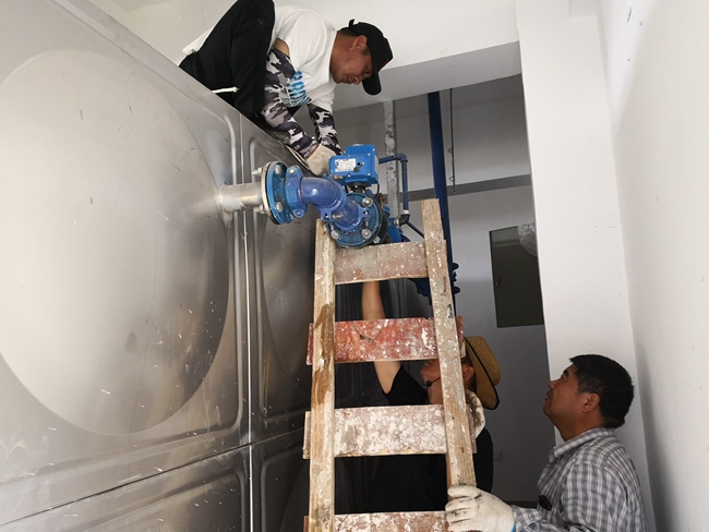 抢修现场,工作人员经过仔细勘察,并通过自动供水配电柜的各项数据逐一排查,最终确定为进水水力阀锈蚀损坏,失去水箱满水时自动停水的功能,造成水箱溢水现象发生。由于泵房内维修空间狭小,操作有一定难度,为了保证居民生活用水不受影响,自来水班组 想方设法,一方面安排专职人员现场监督安全,另一方面,安排熟练的操作工 在狭小的空间里半蹲着操作维修,甚至 还要进入水箱内更换配件,拆除坏阀门、连接管道、加装防漏水皮垫、拧紧螺丝等多道工序顺利完成 。经过近 3小时的奋力苦干,终于抢修完毕,恢复正常供水,有力的保证了小区居民的生活用水。 (张根玲)