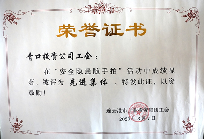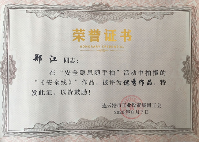 集团公司工会5月以来开展了“安全隐患随手拍,合保安康你我他”为主题的“安全隐患随手拍”活动,青口工会广泛宣传,组织广大职工积极参与,期间共收到职工“随手拍”作品近二十件,并上报集团公司参加比赛,经上级专家评审,我公司工会被评为“先进集体”,郑江作品《安全线》获得优秀作品奖。