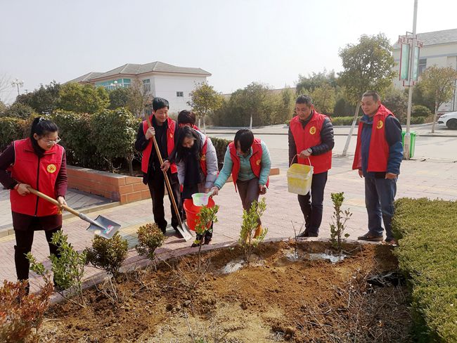 会后,服务中心与社区一行人身穿红马甲迅速投入到紧张的植树活动中,大家三五人一组,分工协作、配合默契,扶起树苗、挥锹铲土、培实新土,齐心协力种下一株株树苗,呈现出一派火热的劳动场景。