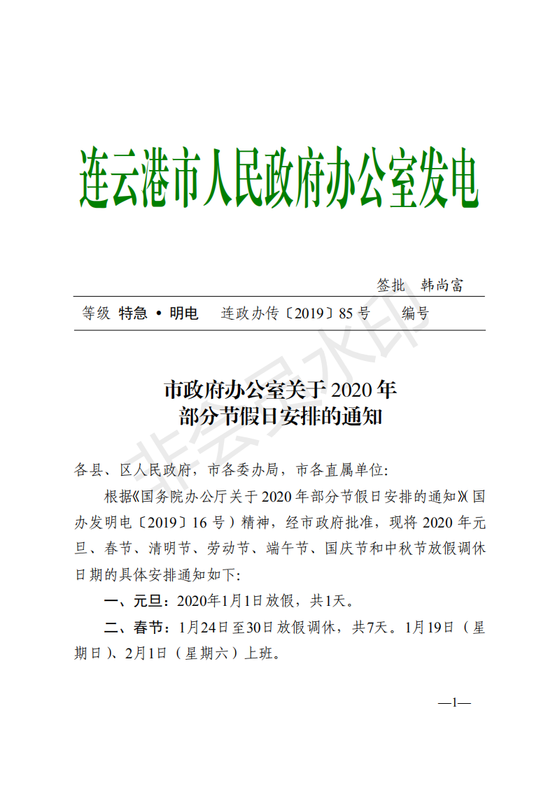 市政府办公室关于2020年部分节假日安排的通知