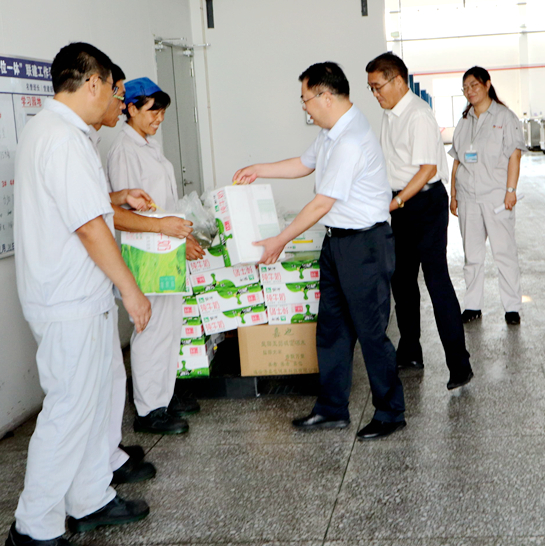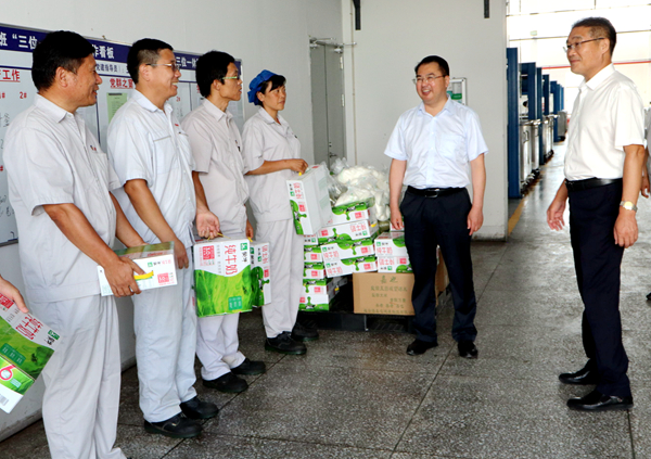 8月1日上午,集团公司党委副书记戴鸿鸣、工会主席刘承志来我公司慰问生产一线员工,为辛勤工作的员工送来牛奶、绿豆等防暑降温慰问品。公司党支部书记、副董事长邹德兵,总经理韩立新等多位领导陪同。