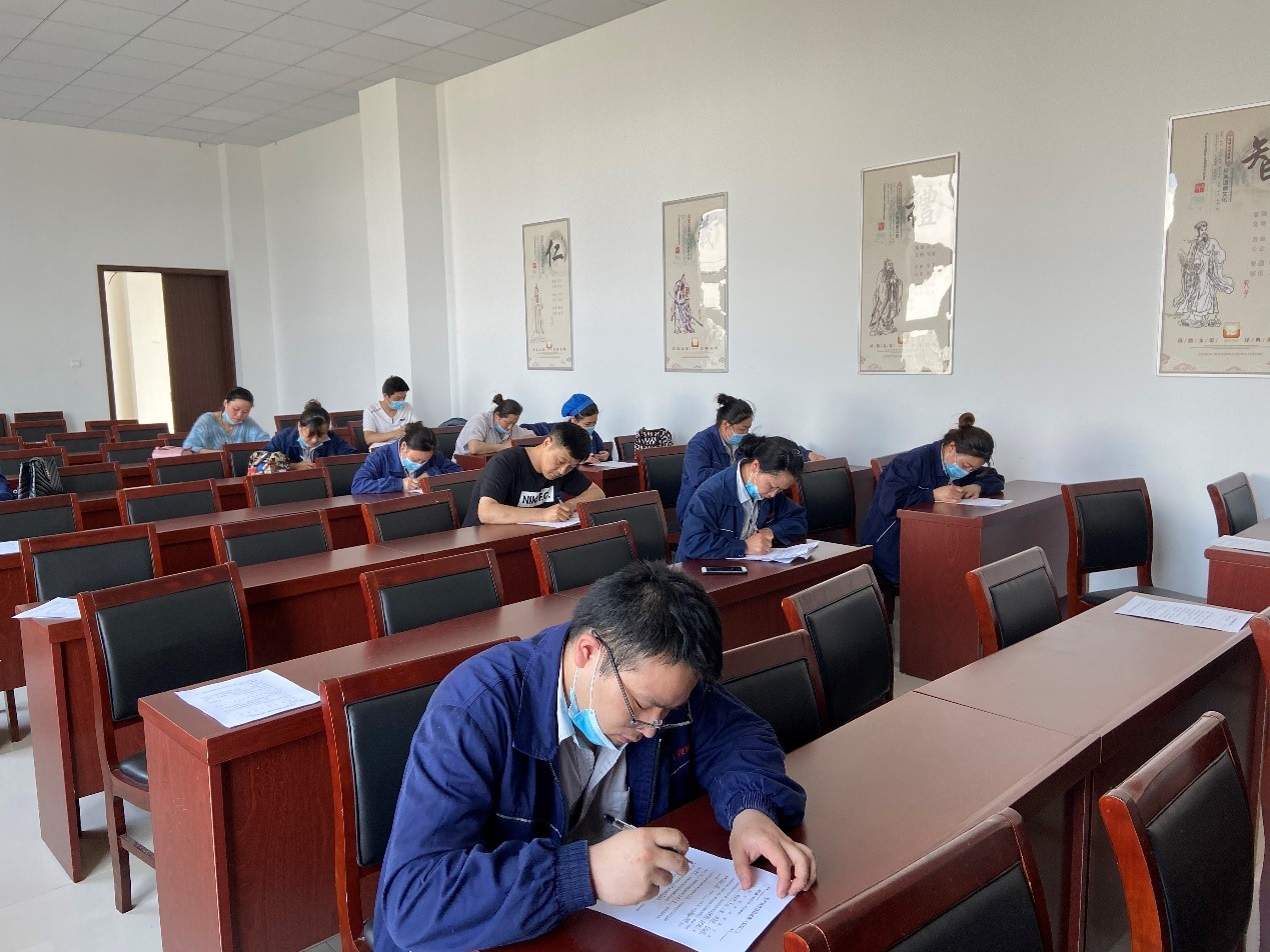 截至5月27日,生产设备部3个生产班组已全部顺利完成后纺作业培训,进入后纺操作技能笔试阶段。(图为5月27日上午,生产丙班后纺员工参加后纺操作技能笔试考核。)