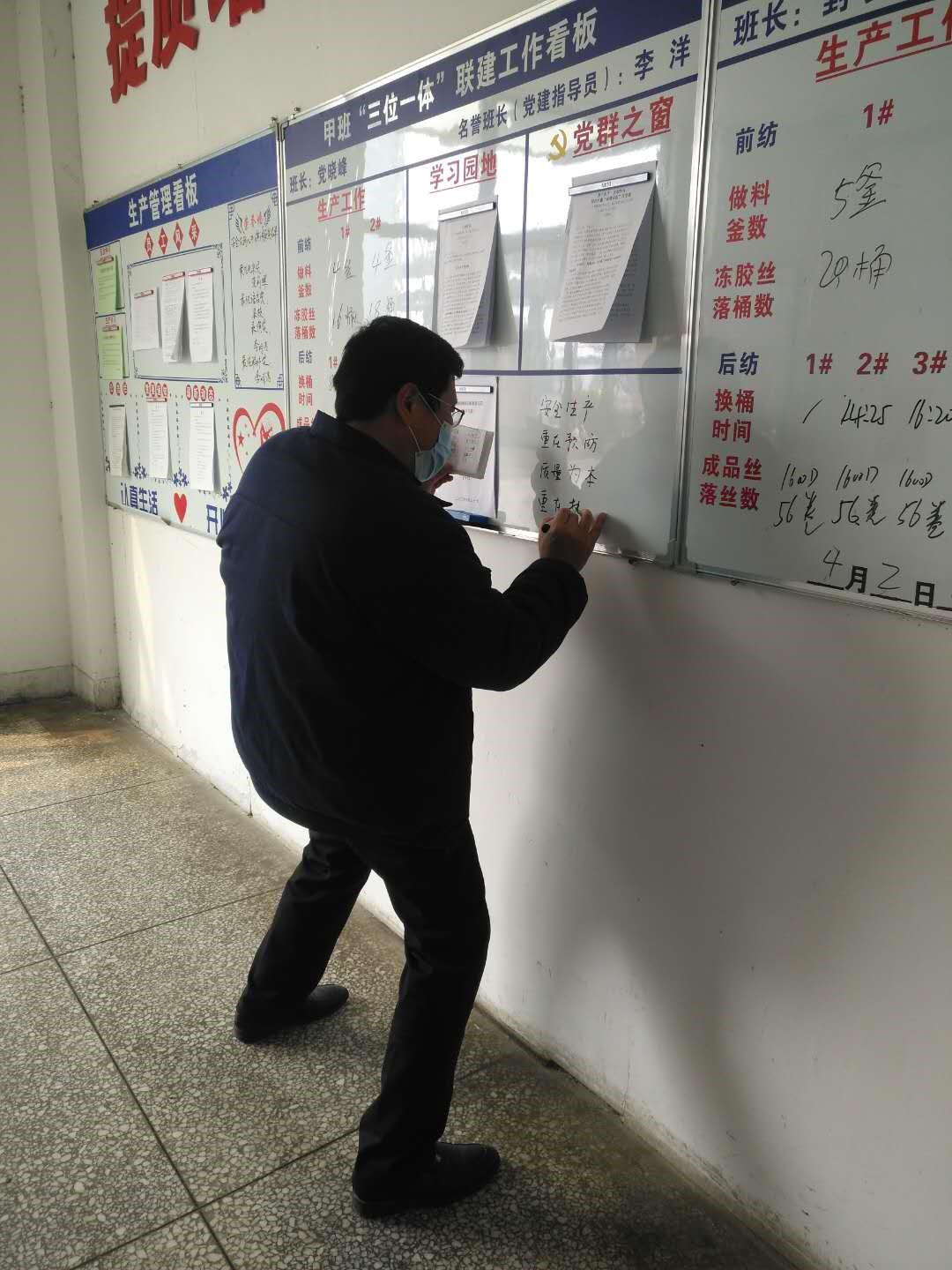 图为生产设备部副部长王勇为甲班书写班组口号。
