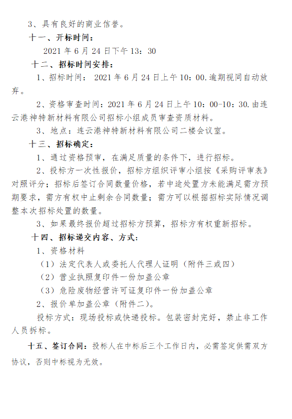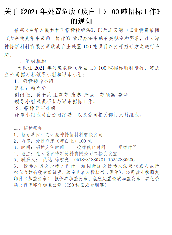 关于《2021年处置危废(废白土)100吨招标工作》的通知