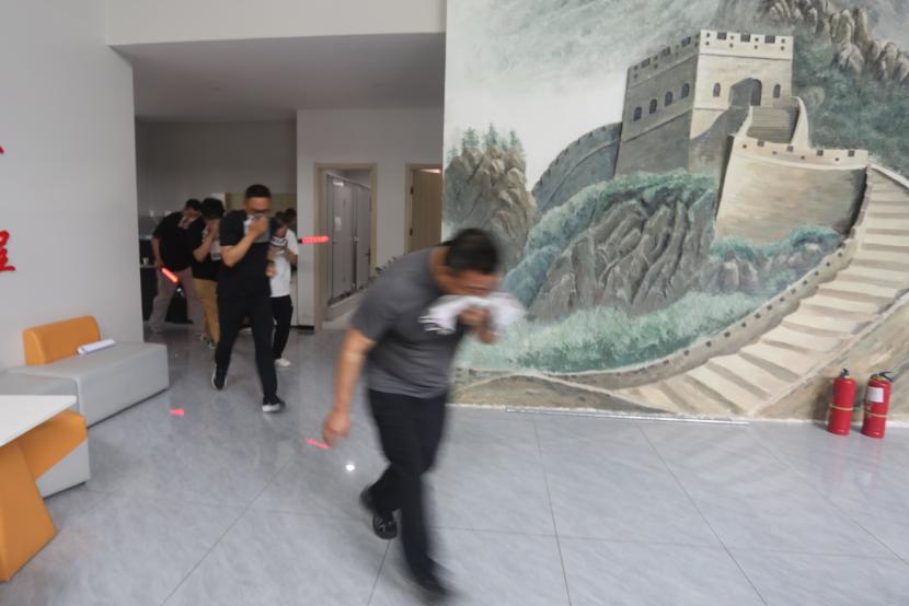 理论培训结束后,随即开展了应急疏散演练。公司成立消防应急指挥部,公司党委书记、董事长王德志作为现场演习总指挥,负责演习现场灭火指挥。灭火行动组、疏散引导组、设备保障组、安全警戒组、医疗救护组、通讯联络组、信息宣传组等专业小组准备就绪,在收到火情报警电话后,第一时间集结各组进行应急任务分配和人员调度启动应急演练。随着警报声响起,办公楼内全体员工迅速按照预定的疏散路线,捂住口鼻、弯腰低姿,有序地向办公楼外安全区域疏散。整个疏散过程紧张有序,演练时长控制在2分钟以内,有效检验了公司应急预案的可行性和员工的应急反应能力。