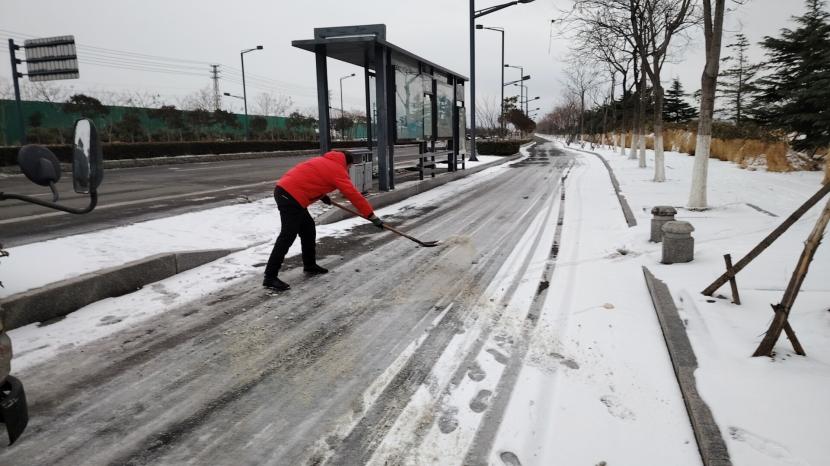 “融雪剂抛洒的时候要均匀抛洒,不要成团堆积,这样不仅融雪的效果不好,还会浪费物资。”预备党员武新忠一边说着,一边示范着给其他队员。哪里的积雪最厚,哪里就有他们挥锹铲雪的身影。在融雪剂不能及时送达的情况下,他们就使用人工除雪的方式,不断档、不离线、不缺位的清除路面积雪,保证路面不出现积雪状况。为坚决完成上级“雪停路净”的扫雪除冰任务,他们不畏严寒,冒着风雨冰雪,昼夜不停,连续三天奋战在扫雪的一线!以雪为令,雪不停,扫雪不止,一直坚守在扫雪工作中,有效清除了区域内的积雪,确保了交通道路的安全畅行。