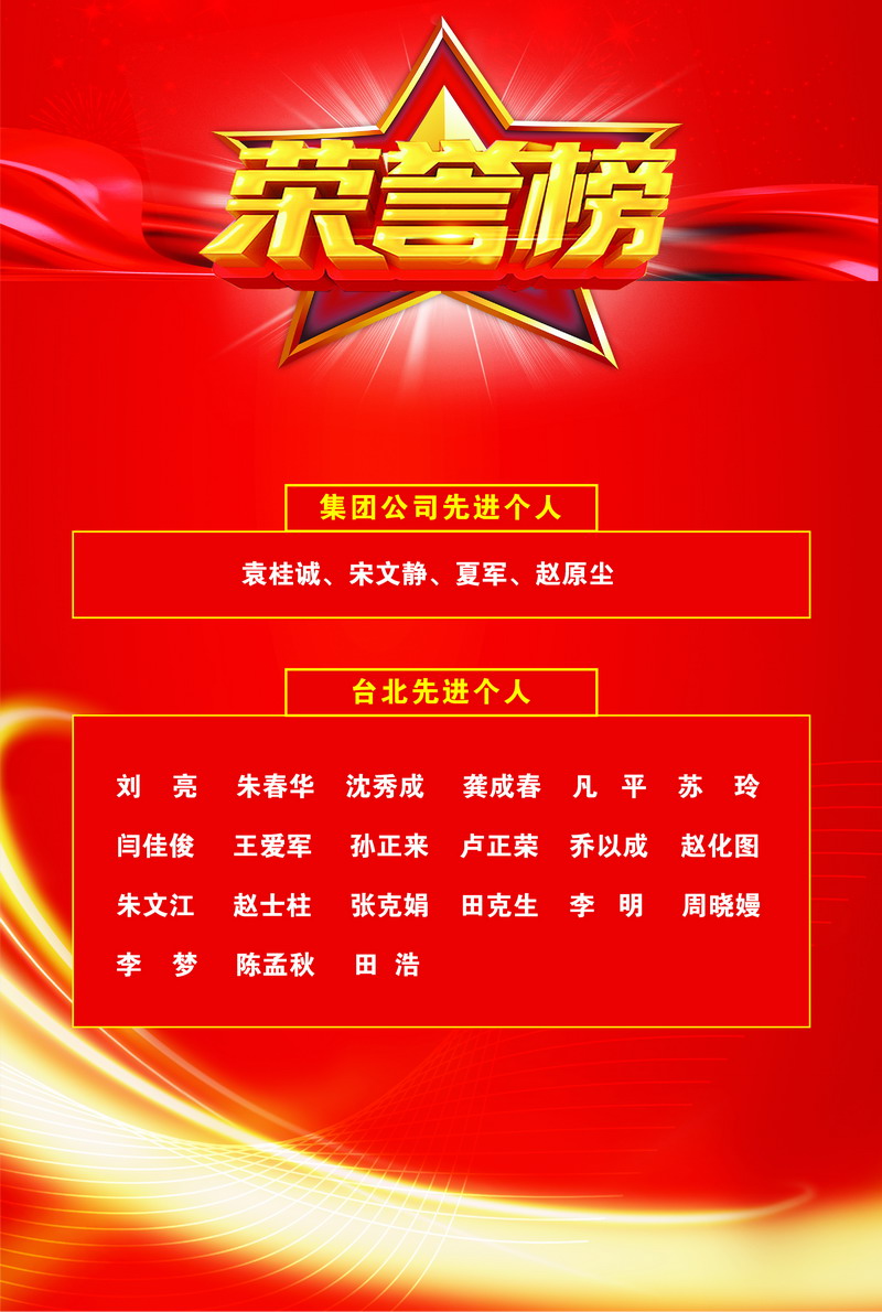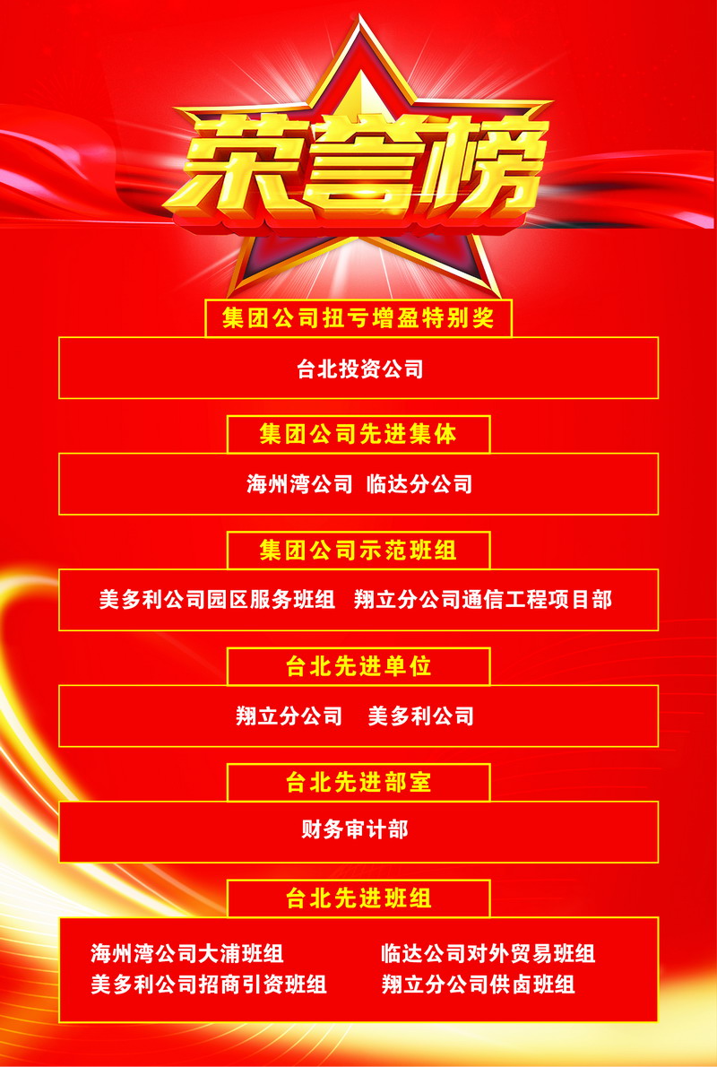 台北投资公司连续两年被集团公司授予“扭亏增盈特别奖”;海州湾公司、临达分公司被评为先进集体;美多利公司园区服务班组、翔立分公司通信工程项目部被评为示范班组;夏军、赵原尘、袁桂诚、宋文静被评为优秀员工。
