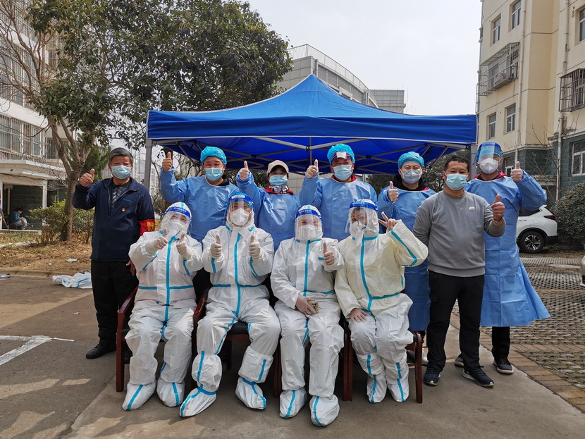 清晨6点30分,1号检测点,李明同志在检查物资,“大白”服装4套、“小蓝”服装6套、棉签600根……;2号检测点,于洪亮在将物资上桌,病毒核酸检测试管、棉签、消毒液,“还缺少一瓶酒精,我立即反馈给社区,请社区抓紧安排送来”;4号检测点,苏玲、秦黎明正在互相帮忙穿好防护服,“秦姐,这个防护面罩里外有两层薄膜,我给你撕掉,这样就不会有雾气了”,“嗯嗯,你这个拉链得拉到顶,我们自己也一定要做好防护”秦黎明温柔的说;5号检测点,内退党员孙芳和姜海洋,互相在防护服后背写上对方的名字,以便于更高效的完成检测工作;6号检测点,霍正钢、朱文健、韩永刚、邱荣滨正在清点检测小卡片;7号检测点,张强在拿着酒精给废物处置垃圾箱消毒;8号检测点,新加入的孙银、占恒春、尹永明、韩永光、赵绍庆正在给消杀喷雾剂灌装84消毒液,社区8个检测点的消杀工作全部由昌圩临时党支部志愿者负责。