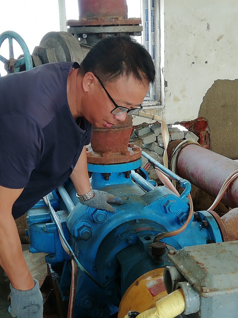 在徐圩运盐河畔,玻璃钢管道维修现场,发电机隆隆轰鸣声中不时夹杂着角磨机刺耳的打磨音,所到之处风尘飘扬。白色尘雾中,一名五十多岁的中年汉子正凝神专注的低头操作,仔细的打磨着玻璃钢管道接头的每一片角落,丝毫不敢马虎。不时,他摘下眼镜取下戴在嘴上的防护口罩,鼓起腮帮用力吹去眼镜上飘落的粉尘。顾不得擦一把额头上的汗水,戴好眼镜和口罩,调整好位置继续俯下身打磨,他就是翔立分公司顾圩泵站班组长顾昌全。