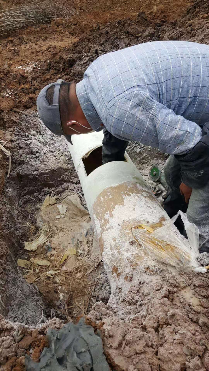 然而,玻璃钢管道的修补在技术上要求比较严格!修补工艺看似简单,其实如果不深入了解和充分掌握树脂胶的性质、用途、以及促进剂,固化剂的配比率,混合工艺等要求的话是不行的。当今世界上有一百多种树脂胶,按使用情况要求的不同进行合理选择。(我们就曾经错把用作钢管表面做防腐涂层的树脂胶购买来维修玻璃钢管道。结果,修补的接头与原管材料不是同一种性质的,两者间发生了不能相融的化学反应,最终还是脱胶漏水。)更加苛刻的是树脂胶绝对不溶于水。操作时如果不慎滴入一滴汗水的话,在管道修补表面上就会出现硬币大小的空壳,使得经过树脂胶涂覆的无碱布与原管体间产生空隙,在管道打水时管内高达1.0MPa压力的作用下形成漏水点。而我们的钙液管道都是正常投入使用的在用管道,管道里满是钙液卤水,这更是给管道修补技术难上添难。