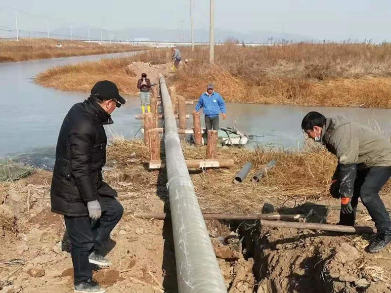 难!难!难!有困难才具有挑战,在“四拼”前一切困难皆为“纸老虎”,大家及时将压力变为动力。确定方案后,立即分头行动,一切工作按部就班,购买8米木桩,河岸边专人指挥长臂挖掘机机械打桩,头顶高压线与通信线路相互交织,现场安全员全过程监督指挥保障施工安全距离紧张施工,利用简易泡沫筏人工敲开河面冰层,划到河心钻孔安装木横担,人工开挖河对岸管道,切割吊取管道,打磨涂覆,一切都在有条不紊的进行中。考虑到玻璃钢管道的易碎性,不敢使用挖掘机吊装,只能全人工小心翼翼的一小段一小段的轻抬慢放,慢慢挪到门型横担上缓缓过河,捆绑固定,最后是对口缠裹涂覆回填竣工。