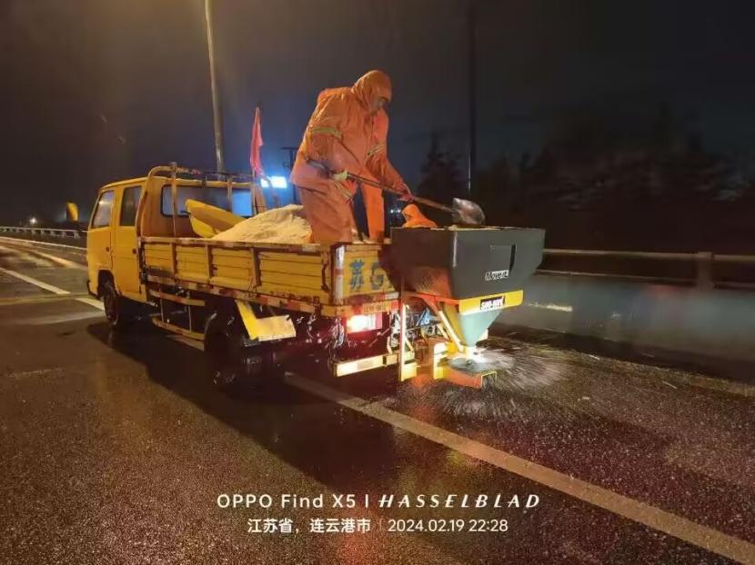 夜晚12点,在佟圩路马山立交,孙玉虎在工程车上一边抛撒融雪剂一边指挥:“融雪剂一定要撒布均匀,适当扩大距离,避免浪费。”工程班金华、苏志国、林军、李林不停地在风雪中挥舞着铁锨,丝毫顾不上被风雪击打的面部疼痛。