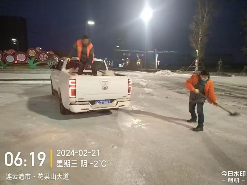 凌晨3点,葛中仁、孙银、薛兴华、伏广军奋战在花果山大道除雪现场,由于冰冻严重、路面湿滑,工程车行进过程中举步维艰,他们互相配合、齐心协力,时刻关注路面情况,确保道路无积雪、无结冰。