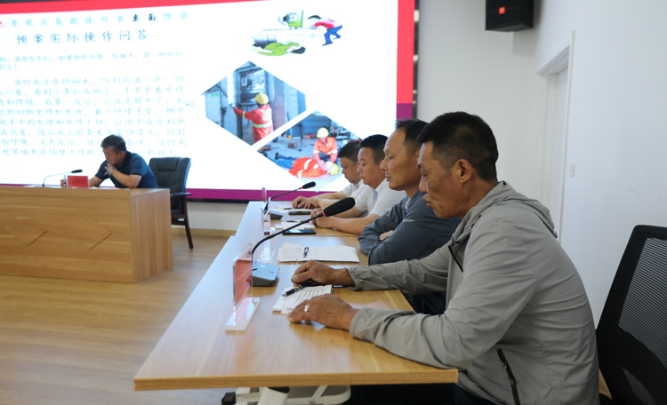 演练上,主持人向参加活动人员介绍了演练预设场景:“2023年6月某日下午3点,悦升公司机修班组工作现场全体工作人员正紧张有序地进行维修工作,设备维修人员李某正在检维修区域使用电焊机对一车辆进行焊接作业,检维修人员陈某在一旁修轴承。这时,由于焊钳处电源线破损严重发生漏电,导致李某突然触电倒地,陈某见状大惊,反应过来后立马拔掉电焊机电源插头,带上绝缘手套将带电电线移开,随后立刻向周边大声呼救。”随后,由演练主持人根据情景事件提出问题,分别请现场第一发现人、现场负责人、总指挥、应急办公室主任、警戒疏散组组长等参演人员进行回答。演练组织有序,现场氛围和谐,参演人员回答问题逻辑清晰,达到了熟练掌握应对触电事故流程、事故处理基本原则、各级岗位职责的目的。