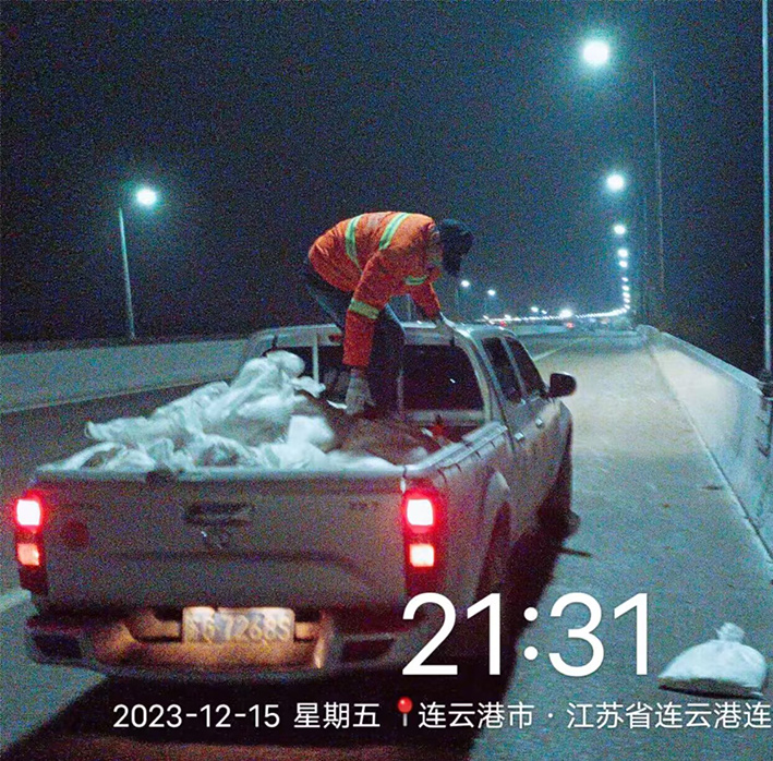 1215日夜间21时左右,受寒潮影响,徐圩大地瞬间飘落鹅毛般雪花。为保障新城主要干道车辆、行人往来石化园区安全畅通经过。保洁分公司结合徐圩城建与悦升公司冬季突发天气处置预案,闻雪而动,第一时间启动布放融雪剂工作,大桥两侧尽显保洁人无惧严寒劳动场景。