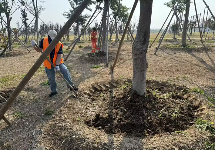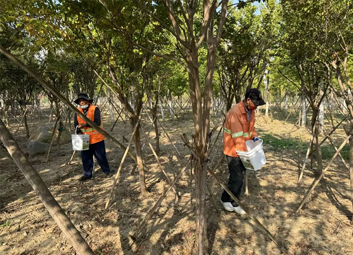 张圩河公园为绿化苗木施肥、浇水“解渴”